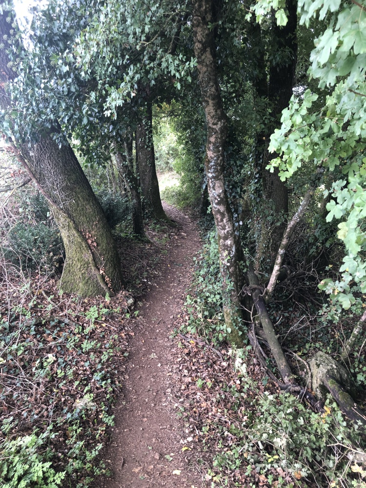 Prendre le chemin derrière la grange, et à son terme prendre à droite, sous les arbres, le sentier de la "voie romaine" (Photo 4).