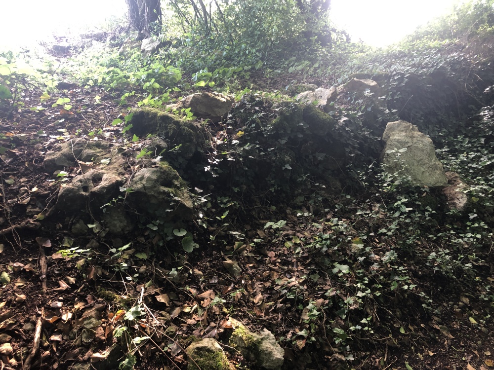 Abandonner ce chemin lorsqu'il part à droite pour pénétrer droit devant dans une allée boisée un peu caillouteuse (Photo 1). Découvrir alors la réalité construite de de la voie "romaine", antique itinéraire reliant Angoumois et Périgord et marquant sur une longue distance la limite entre les communes de Brie et Champniers.