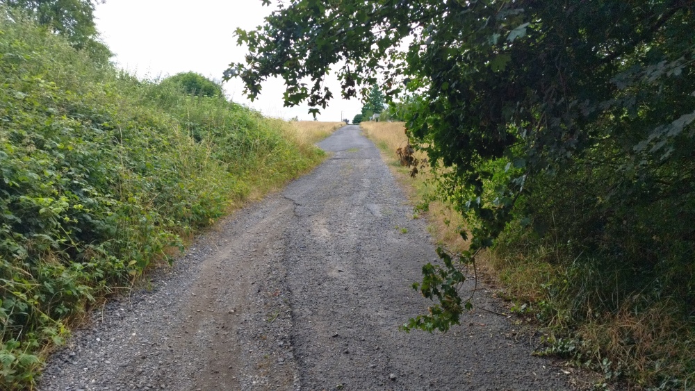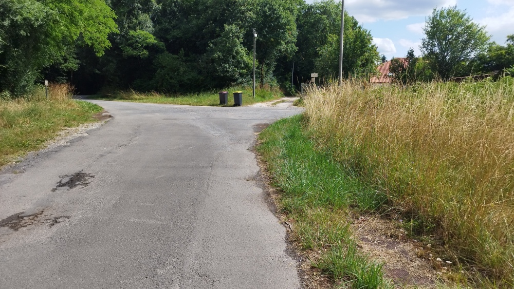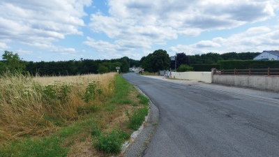 Prendre à gauche rue René Sardain en direction du camp militaire. À environ 500 m tourner à droite et longer le camp. Suivre le chemin jusqu’à la rue de la Chapelle. Tourner à gauche en face du garage pour arriver à l’entrée sud du village des Frauds.